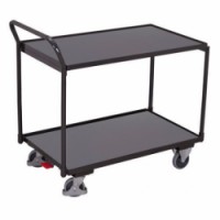 Policové vozíky se dvěma policemi vhodné pro přepravu materiálu a předmětů ve skladě. Police vyrobené z MDF desek jsou zasazené do kovových rámů vozíku s 12mm hranou. Pojezd zajišťují čtyři kola s valivými kuličkovými ložisky, z nichž dvě jsou pevná a dvě otočná s brzdou Easy Stop a ochrannými kryty.Policové vozíky s madlem, do 250 kg, 2 police