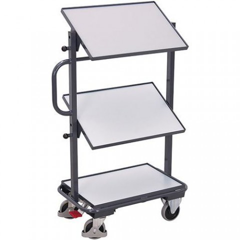 Ocelový ESD vozík se dvěma nakloněnými policemi v úhlu 15° nebo 30°. Ložná plocha z elektricky vodivé laminované dřevotřískové desky o rozměru 600 x 400 mm, okraj vysoký 10 mm. Nosnost police je 50 kg. Pojízdnost zajišťují dvě pevná a dvě otočná kola z termoplastické pryže na plastovém ráfku s kuličkovými ložisky, nezanechávají stopy na podlaze.Policový vozík se šikmými policemi ESD, 3 police, šedý
