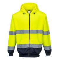 Nadčasová mikina na zip reflexními prvky pro vysokou viditelnost. Stahovací kapuce, elastický pás a manžety pro pohodlné nošení, velké kapsy pro ukládání věcí. Tkanina odráží 98 % UV záření (50+ UPF). Vyrobeno z 65% polyesteru a 35% bavlny 300 g. Splňuje normy EN ISO 20471 Třída 3; AS/NZS 4602.1:2011 Class D/N.Reflexní mikina Elfi Hi-Vis na zip, žlutá/modrá