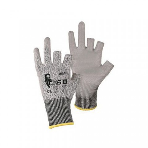 Bezešvé protipořezové rukavice s odolností proti řezu 5, s dlaněmi a prsty máčenými v polyuretanu. Vynikající odolnost proti oděru a pořezání ostřím. Doporučené aplikace: logistika, skladování, letecký průmysl, sklářský průmysl, řezání suchých, lakovaných nebo galvanizovaných dílů, montáž kovových komponentů, lisování a vstřikování plastů, montáž bílého zboží, údržba, karosárny, práce s kovovými plechy. Velikost: 8-10Rukavice CXS CITA 3F, protipořezové tříprsté, šedé