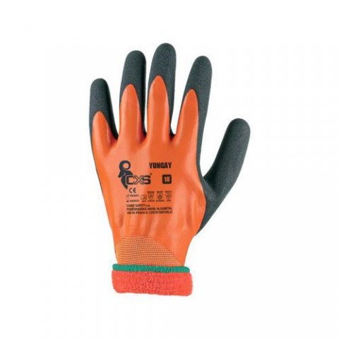 Zimní bezešvé rukavice z polyesterového úpletu s elastanem, povrstveny dvojitým latexem s pískovou úpravou v dlani pro lepší úchop, podšívka z česaného akrylového úpletu, pružná manžeta, ochrana proti kontaktnímu teplu do 100 °C. Doporučené aplikace: stavebnictví, hobby, práce ve vlhkém a chladném prostředí, práce s horkými předměty do 100 °C, logistika, mrazírny, strojírenství, montáže, zemědělství, automobilový průmysl, chladírenský průmysl, údržba, komunální služby. Velikost: 08-10 Normy: EN 388, EN 420, EN 511, EN 407 Sezóna: Zimní Svrchní materiál: Materiál : polyester/elastan, akryl, Materiál povrstvení : dvojitý latex s pískovou úpravou Vlastnosti rukavic: Kontaktní teploRukavice CXS YUNGAY, zimní, máčené v latexu