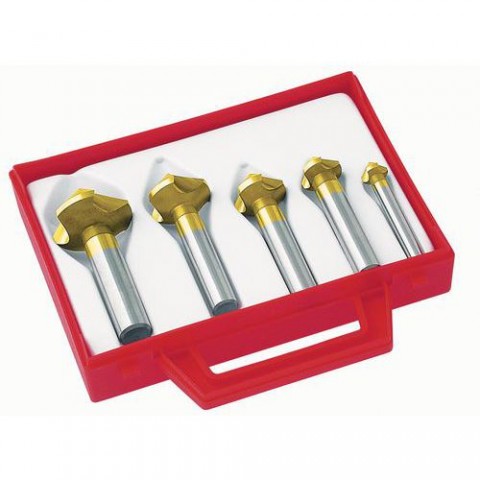Tříbřité frézy s úhlem 90°. Povlak TiN pro delší životnost.Sada 5 vrtáků na zkosení HSS