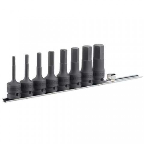 Sada 8 šroubovacích nástrčných hlavic 1/2" pro šrouby se šestihrannou hlavou. Zahrnuje velikosti: NSHM.5, 6, 8, 10, 12, 14, 17, 19. Dodává se na stojanu (CKS.95). Hmotnost: 1,20 kg.Sada nástrčných šroubováků 1/2", 8 ks