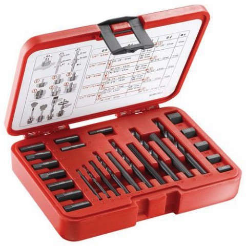 Extrakce vrtáním a vložením drážkované tyče zatlačené šestihranným vrtákem. Průměr čepů: průměr 6 až 14 mm. Levostranná nebo pravostranná rozteč. Dodáváno v krabici, rozměry (D x Š x V): 165 x 130 x 25 mm. Hmotnost: 540 g.Sada vytahovačů svorníků Facom, pravá/levá
