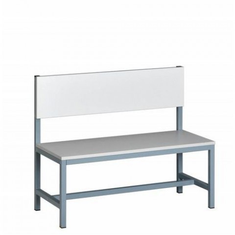 Lavice dodávány v délkách 1000, 1500 nebo 2000 mm. Hloubka lavic 400 mm, sedací výška 400 mm. Lavice tvoří stabilní rám ze čtyřhranné trubky 30 x 30 mm, lakovaný práškovou barvou. Nohy lavic jsou opatřeny plastovými kluzáky, sedák a opěradlo jsou vyrobeny z laminované desky šedé barvy tl. 18 mm, sedací výšky 400 mm.Šatní lavice s opěradlem, 1500 x 400 x 800 mm