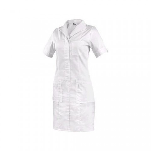 Dámské šaty s krátkým rukávem, vpředu i vzadu tvarovány princesovým švem, u krku pohodlná rozhalenka, délka ke kolenům, kryté zapínání na baby druky, náprsní kapsa vlevo, 2 spodní kapsy nakládané kapsy s volným spodním okrajem. Doporučené použití: wellness, kosmetické salóny, soukromé ordinace, kliniky a velká zdravotnická zařízení, lázeňská zařízení, ústavy sociální péče, lékárny, školy se zdravotnickým zaměřením. Velikost: 38-58 Normy: EN ISO 13688 Svrchní materiál: 62 % bavlna 35 % polyester 3 % elastan Obor: Zdravotnictví Obor: Ostatní službyŠaty CXS BELLA, dámské, bílé