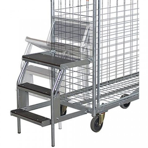Kovové schůdky k vychystávacím vozíkům. Stupně z voděodolné lepené překližky s protiskluzovým povrchem.Schůdky k vozíkům, 3 stupně