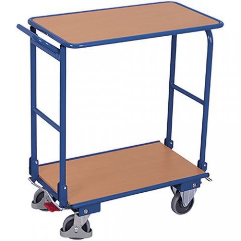 Skládací policový vozík s ocelovou konstrukcí. Ložná plocha z MDF desky. Dvě pevná a dvě otočná kola s brzdou EasySTOP. Šedá kola z termoplastické pryže nezanechávající stopy na plastovém ráfku s přesnými kuličkovými ložisky, ochrana nohou.Skládací policové vozíky, 2 police, 89 x 45 x 97 cm