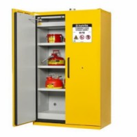 Bezpečnostní skříň se dvěma křídlovými dveřmi pro skladování hořlavých a chemických látek. Tělo skříně vyrobené z 1 - 1,5mm oceli. Povrchová úprava z epoxidové pryskyřice, která je vysoce odolná vůči kyselinám. Vnitřní melaminové panely z minerálních vláken s vysokou hustotou zpomalují hoření. V případě požáru a zvýšení okolní teploty na 50 °C se aktivuje automatické zavření dveří a dojde také k jejich bezpečnému zajištění. Takto zajištěná skříň i její obsah odolá ohni minimálně 90 minut, což poskytuje dostatečnou dobu pro evakuaci osob i zásah hasičů. Dveře se otevírají i zavírají ručně a zahrnují tlumič, který nastavuje sílu potřebnou k pohybu dveří. Vyjímatelná záchytná vana s perforovanou vložkou pro záchyt úkapů. Vybavená třemi policemi, které lze výškově nastavit v krocích 32 mm. Přesun prázdné skříně lze provést za pomocí paletového vozíku. Skříň je v souladu s EN 14470-1:2004 (TYP 90) .Skříň na hořlaviny Justrite EN 90, 207 x 120 x 60 cm