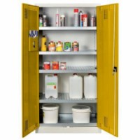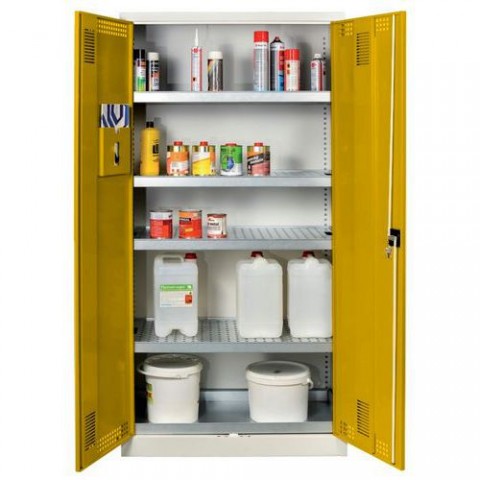 Skříně pro uložení chemických látek ve vlastním obalu. Uložené kapaliny stojí na roštu a tím nezmenšují záchytný objem polic. Skříň obsahuje 4 záchytné police s roštem o záchytném objemu 19 l na polici a spodní záchytnou vanu bez roštu o objemu 20 l. Dvoubodové uzamykání cylindrickým zámkem na klíč. Vyztužené dveře s větracími otvory uložené na vnitřních čepech lze otevřít do úhlu 110°.Skříně na uskladnění kapalin, 1950 x 950 x 500 mm