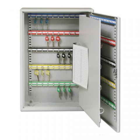 Ocelová uzamykatelná schránka určená k uložení klíčů s číslovaným seznamem na vnitřní straně dvířek. Příslušenství obsahuje samolepící čísla, identifikační schéma a upevňovací materiál.Skříňka na klíče, 150 háčků