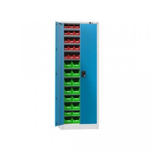 Skříně série UK s křídlovými dveřmi s úhlem otevření více než 90° jsou lehčí formou dílenských skříní. Používají se především pro ukládání méně rozměrných a lehčích materi??lů nebo jako úložiště plastových boxů pro drobnější materiál. Skříně jsou zamykatelné originalním POLAK design zámkem dvoubodového zamykacího systému s tichým chodem. Police jsou stavitelné. Dílenská plechová skříň s křídlovými dveřmi s úhlem otevření více než 90° je lehčí formou dílenských skříní a používají se především pro ukládání méně rozměrných a lehčích materiálů nebo jako uložiště plastových boxů pro drobnější materiál. Stabilní konstrukce z ocelových plechů.Skříňky s boxy UK2-B21, 700 x 400 x 1950 mm
