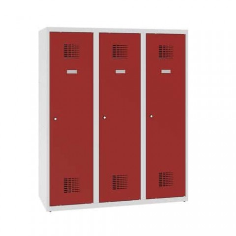 Třídveřové šatní skříně se sníženou výškou. Vhodné do škol pro žáky prvního stupně. Vyrobeny z ocelového plechu s povrchovou úpravou práškovým lakem. Skříně jsou vybaveny dvěma policemi na knihy, policí na boty a součástí jsou také 2 háčky na oblečení a samolepící jmenovka na dveřích. Větrací mřížky ve dveřích, úhel otevření dveří s bezpečnostní pojistkou max. na 90°, samolepicí štítek na jméno, možnost dokoupení horního šikmého nástavce. Uzamykání cylindrickým tříbodovým zámkem.Snížené školní šatní skříně, 3 sloupce, 400 mm, tříbodový cylindrický zámek
