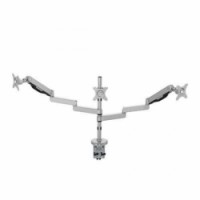 Polohovatelný držák na tři monitory MS005T. Držák lze upevnit svorkou na kraj desky stolu (svorku lze použít pro desky tloušťky 20 - 120 mm). Držák je možno namontovat také do průchodky na kabely, potřebujete k tomu průchodku o průměru 70 mm. Pro snadné nastavení sklonu a výšky monitoru obsahují ramena držáku plynový píst. V základně držáku jsou k dispozici 2 volné USB porty. Nosnost (upevnění na svorku) 2 - 9 kg pro každý monitor. Max. nosnost (upevnění přes průchodku na kabely) 27 kg. VESA standard 75 x 75 nebo 100 x 100 mm. Nastavení sklonu v rozmězí -85° až 15 °.Stolní držák na 3 monitory MS005T, šedá
