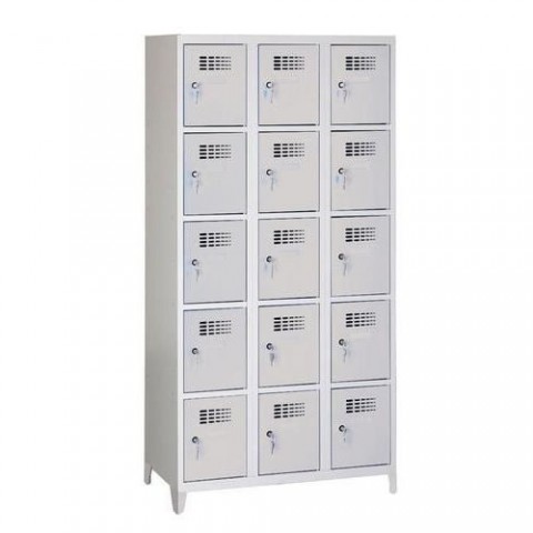 Svařované boxové skříně s odlehčenou konstrukcí a výztuhami zajišťujícími dobrou stabilitu. Vhodné pro odkládání osobních věcí na pracovištích, kulturních akcích, v převlékárnách apod. Vyrobeno z ocelového plechu tloušťky 0,5 mm. Perforovaná dvířka zavěšená na vnitřních pantech zajišťují účinné odvětrávání vnitřního prostoru. Jednotlivé boxy jsou samostatně uzamykatelné cylindrickým zámkem s možností výměny za otočný uzávěr (nutno dokoupit zvlášť). Možnost umístění štítku se jménem.Svařované šatní skříně Eric odlehčené, 15 boxů, cylindrický zámek