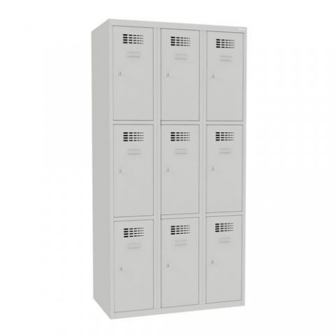Šatní skříně s boxy v několika barevných variantách, vhodné pro odkládání osobních věcí zaměstnanců na pracovištích, v převlékárnách nebo sportovních klubech. Odlehčená konstrukce z ocelového plechu tloušťky 0,5 mm s výztuhami zajišťuje dobrou stabilitu. Účinné odvádění vlhkosti z oděvů větracími otvory na dveřích. Dvířka boxů jsou zavěšená na vnitřních pantech. Uzamykání každého boxu cylindrickým zámkem. Snadno udržovatelný hladký prostor uvnitř boxu. Možnost umístění štítku se jménem v horní části dveří.Svařované šatní skříně Jeff, 9 boxů, cylindrický zámek