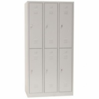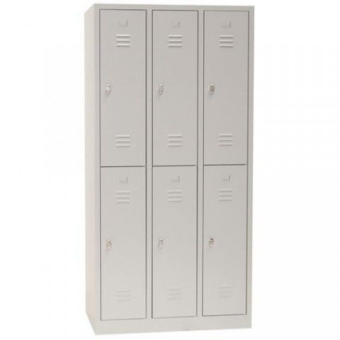 Šatní skříňka na soklu protihlukovými zarážkami. Perforace pro montáž na stěnu. Horní a spodní větrání na přední straně. Zesílené dveře s neviditelnými panty a vyražené držáky štítků.Svařované šatní skříně Manutan Expert, 6 oddílů, na soklu, bez zámku