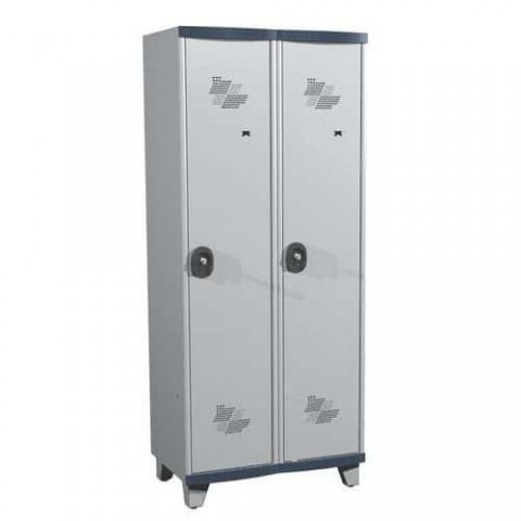 Svařovaná šatní skříň z odolného profilovaného ocelového plechu o tloušťce 0,6 mm (odpovídá 0,8 mm standardnímu). Každý oddíl je vertikálně rozdělen mezistěnou umožňující odložení čistých a špinavých oděvů. Zaoblené rohy pro větší bezpečnost uživatele. Odolná dvířka se otevírají až do úhlu 180°. Perforace ve dveřích i konstrukci skříně pro lepší odvod vlhkosti. Možnost umístění štítku se jménem. Uzamykání cylindrickým zámkem se dvěma klíči.Svařované šatní skříně s mezistěnou Acial, 2 oddíly, 400 mm, na nohách, cylindrický zámek