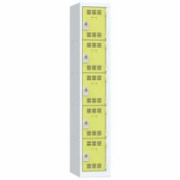 Více-oddílová šatní skříň svařovaná z ocelového plechu tloušťky 0,7 mm. Jednotlivé oddíly jsou samostatně uzamykatelné otočným uzávěrem na visací zámek (není součástí dodávky). Perforovaná dvířka zajišťují účinné odvětrávání vnitřního prostoru. Možnost umístění štítku se jménem.Svařované šatní skříně Vinco, 1 sloupec, 5 boxů, 300 mm, otočný uzávěr