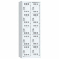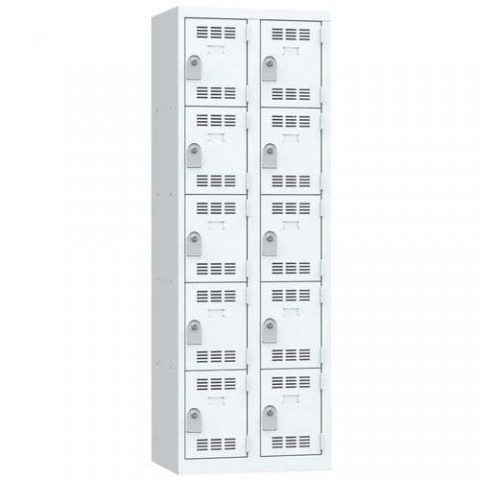 Více-oddílová šatní skříň svařovaná z ocelového plechu tloušťky 0,7 mm. Jednotlivé oddíly jsou samostatně uzamykatelné cylindrickým zámkem se dvěma klíči. Perforovaná dvířka zajišťují účinné odvětrávání vnitřního prostoru. Možnost umístění štítku se jménem.Svařované šatní skříně Vinco, 2 sloupce, 10 boxů, 300 mm, cylindrický zámek