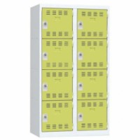 Více-oddílová šatní skříň svařovaná z ocelového plechu tloušťky 0,7 mm. Jednotlivé oddíly jsou samostatně uzamykatelné otočným uzávěrem na visací zámek (není součástí dodávky). Perforovaná dvířka zajišťují účinné odvětrávání vnitřního prostoru. Možnost umístění štítku se jménem.Svařované šatní skříně Vinco, 2 sloupce, 8 boxů, 400 mm, otočný uzávěr
