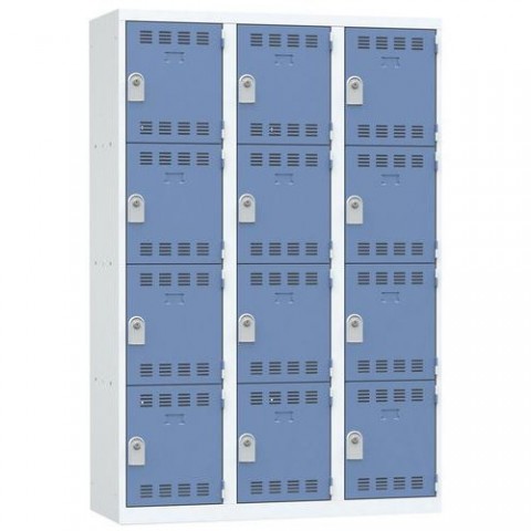 Více-oddílová šatní skříň svařovaná z ocelového plechu tloušťky 0,7 mm. Jednotlivé oddíly jsou samostatně uzamykatelné cylindrickým zámkem se dvěma klíči. Perforovaná dvířka zajišťují účinné odvětrávání vnitřního prostoru. Možnost umístění štítku se jménem.Svařované šatní skříně Vinco, 3 sloupce, 12 boxů, 400 mm, cylindrický zámek