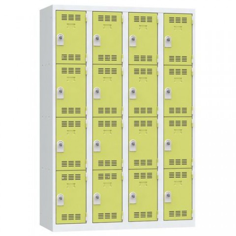 Více-oddílová šatní skříň svařovaná z ocelového plechu tloušťky 0,7 mm. Jednotlivé oddíly jsou samostatně uzamykatelné otočným uzávěrem na visací zámek (není součástí dodávky). Perforovaná dvířka zajišťují účinné odvětrávání vnitřního prostoru. Možnost umístění štítku se jménem.Svařované šatní skříně Vinco, 4 sloupce, 16 boxů, 300 mm, otočný uzávěr