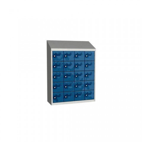Svařované boxové skříně s malými schránkami na osobní věci vhodné do akvaparků a bazénů, na pracoviště nebo recepce hotelů. Jednotlivé schránky jsou samostatně uzamykatelné cylindrickým zámkem na klíč. Možnost umístění štítku se jménem nebo osobním číslem. Opatřeny horním šikmým nástavcem, otevírání dvířek až do úhlu 110°. Upevnění na zeď, vytvoření větších bloků spojením více skříní dohromady.Svařované skříně na osobní věci Olaf, 20 boxů, cylindrický zámek