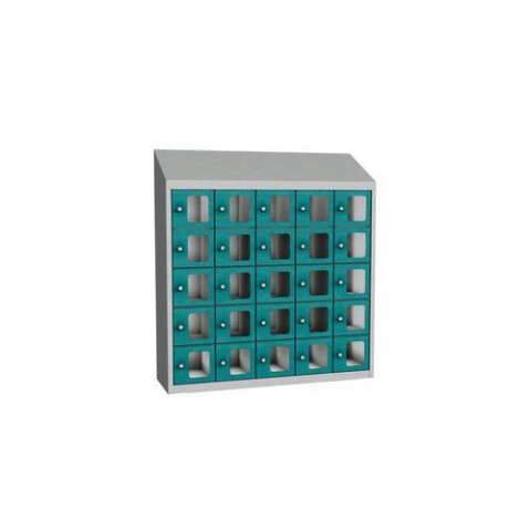 Svařované boxové skříně s malými schránkami s průzorem z plexiskla na osobní věci nebo ke skladování svačin a obědů. Jednotlivé schránky jsou samostatně uzamykatelné visacím zámkem. Možnost umístění štítku se jménem nebo osobním číslem. Opatřeny horním šikmým nástavcem, otevírání dvířek až do úhlu 110°. Upevnění na zeď, vytvoření větších bloků spojením více skříní dohromady. Rozměry průzoru v x š - 117 x 95 mm.Svařované skříně na osobní věci Olaf s průhlednými dvířky, 25 boxů, otočný uzávěr