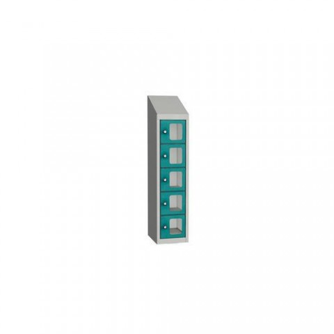 Svařované boxové skříně s malými schránkami s průzorem z plexiskla na osobní věci nebo ke skladování svačin a obědů. Jednotlivé schránky jsou samostatně uzamykatelné visacím zámkem. Možnost umístění štítku se jménem nebo osobním číslem. Opatřeny horním šikmým nástavcem, otevírání dvířek až do úhlu 110°. Upevnění na zeď, vytvoření větších bloků spojením více skříní dohromady. Rozměry průzoru v x š - 117 x 95 mm.Svařované skříně na osobní věci Olaf s průhlednými dvířky, 5 boxů, otočný uzávěr
