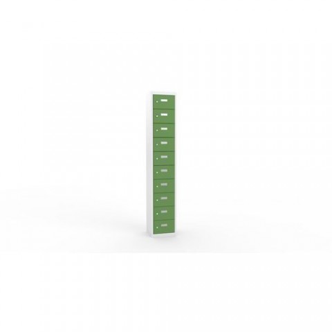 Skříně ze svařovaného plechu s malými schránkami na uložení osobních věcí. Vhodné do kantýny, posiloven, fitness center, bazenů nebo recepce hotelů. Jednotlivé schránky jsou samostatně uzamykatelné cylindrickým zámkem na klíč. Možnost vložení štítku se jménem nebo číslem na dvířka každé schránky.Svařované skříně na osobní věci Ron I, 10 boxů, cylindrický zámek