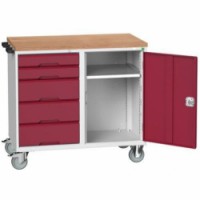 Mobilní údržbový vozík Bott Verso s horní pracovní plochou tloušťky 3 cm typu multiplex/linoleum nebo ohraněný plech s rohoží. Nosnost až 200 kg, robustní svařovaná ocelová konstrukce, povrchová úprava práškovým lakem. Centrálně uzamykatelné zásuvky s výškou 2 x 10 a 3 x 17,5 cm, s nosností 50 kg a 100% výsuvem na válečkových ložiskách. Uzamykatelná skříňka s výškou dveří 72,5 cm, uvnitř pozinkovaná výškově nastavitelná police s nosností 75 kg. Ergonomické rukojeti zásuvek s popisovatelnou lištou, systém blokace otevření více zásuvek najednou. Dvě pevná a dvě otočná kola s brzdou o průměru 12,5 cm, manipulaci usnadňují madla.Údržový zásuvkový vozík Bott Verso, 98 x 105 x 55/60 cm, 5 zásuvek, skříňka, multiplex/linoleum/rohož