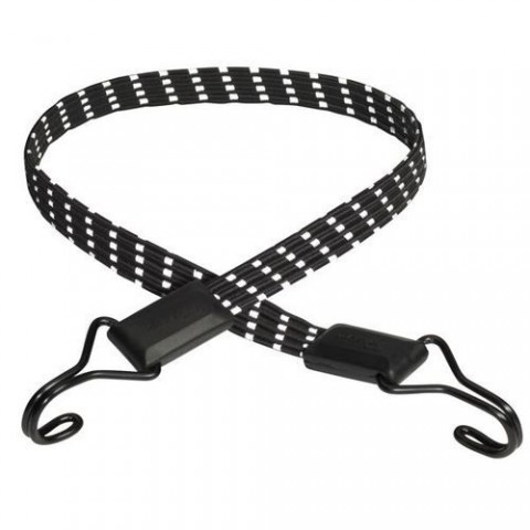 Plochá upínací guma zakončená háčky. Délka gumy 800 mm, šířka 18 mm. Otočné háčky z dvojitého drátu pro větší pevnost v tahu a snadné uchycení nákladu. Zaoblené konce háčků zabraňující poškrábání. Plochá guma pro ochranu nákladu. Bílé reflexní prvky.Upínací guma plochá reflexní Master Lock 80cm
