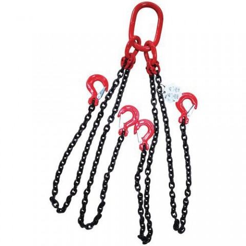 Závěsný řetěz pro lehké provozy se čtyřmi háky s pojistkou. Řetěz s okem a čtyřmi háky. Délka řetězu 1 m. Jakostní třída 8. Vnitřní rozměr závěsného oka 135 x 75 mm.Vázací řetěz s okem a čtyřmi háky, do 1 600 kg