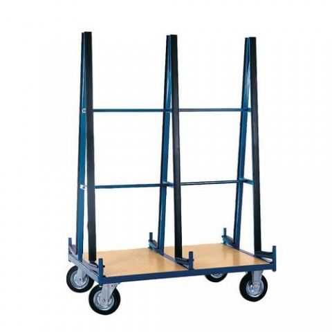 Vozík pro dopravu velkých, těžkých desek a přířezů. Opěrné nosníky pro materiál jsou opatřeny plastovým chráničem. Pohyb zajišťují čtyři kola s valivými kuličkovými ložisky, z nichž dvě jsou pevná a dvě otočná. Povrchová úprava práškovým lakem. Výška plošiny je 29, 33 a 35 cm.Vozík na rozměrné tabule, do 500 kg