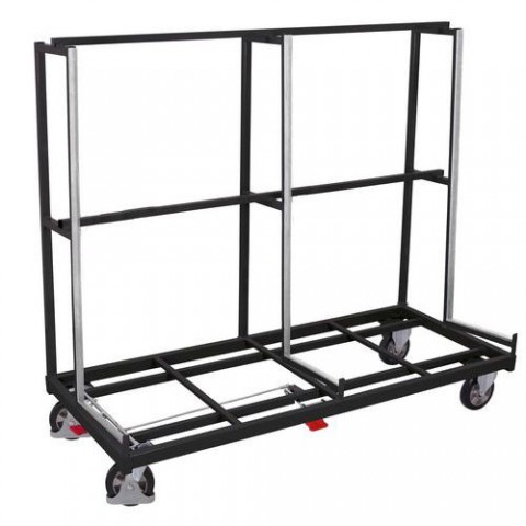 Jednostranný vozík pro přepravu rozměrných desek a tabulí. Nakloněná ložná plocha o 5°, podpěry potažené pryžovým profilem. Šířka ložné plochy 430 mm. Pojízdnost zajišťují dvě pevná a dvě otočná kola z elastické pryže na litém hliníkovém ráfku s přesnými kuličkovými ložisky.Vozíky na rozměrné tabule, jednostranné
