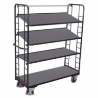 Vozík se čtyřmi policemi z MDF desky vhodný pro přepravu materiálu a předmětů. Horní výškově stavitelné police se sklonem 15° jsou přestavitelné v rastru 12 cm. Jednoduchá manipulace pomocí kovového madla. Pohyb zajišťují čtyři kola s valivými kuličkovými ložisky, z nichž dvě jsou pevná a dvě otočná s brzdou a ochrannými kryty. Vozík je opatřen TUV certifikátem.Vysoké policové vozíky s madlem a šikmými policemi, 4 police