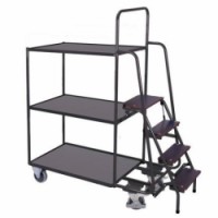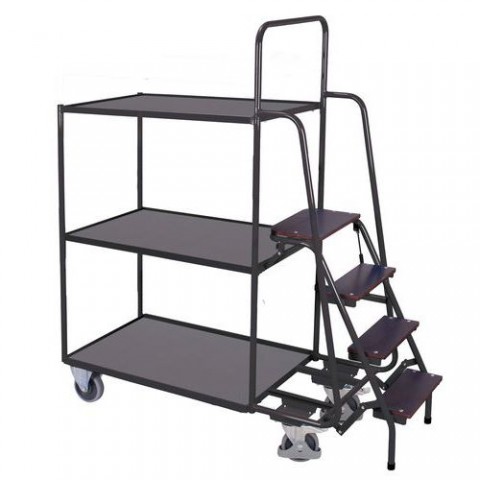 Vysoký policový vozík se třemi policemi a vysokými schůdky. Schůdky se třemi stupni a plošinou umožňují vystoupit do výšky 93,5 cm nad podlahu. Bezpečnost zajišťuje ocelové zábradlí připevněné ke konstrukci vozíku. Police vyrobené z MDF desek jsou zasazeny do kovových rámů. Pojezd zajišťují čtyři kola s valivými kuličkovými ložisky, z nichž dvě jsou otočná s brzdou a ochrannými kryty.Vysoké policové vozíky se schůdky, do 250 kg, 3 police