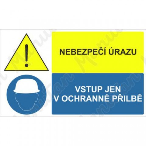 Bezpečnostní značky, tabulky nebo samolepky "Nebezpečí úrazu" splňují požadavky právních a technických předpisů, zejména Nařízení vlády č. 375/2017 Sb., ČSN ISO 3864-1, ČSN ISO 3864-2, ČSN ISO 3864-3, ČSN ISO 3864-4. Používá se k označení míst a objektů, kam je z bezpečnostních důvodů vstup povolen pouze v ochranné přilbě.Výstražná tabulka - Nebezpečí úrazu vstup jen v ochranné přilbě