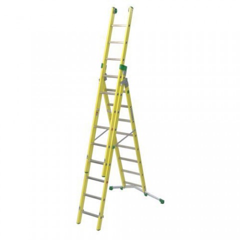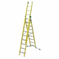 Sklolaminátový trojdílný žebřík vhodný do provozů s vyšším rizikem elektrických výbojů. Žebřík je certifikovaný, splňuje normu EN 131 a EN 61478 v kategorii I. - 30.000 Voltů. Lze sestavit jako stojací štafle nebo výsuvný a opěrný žebřík. Stabilizační teleskopická základna o šířce 83 až 128 cm, plastové protiskluzové patky. Dvě kolečka ve vrchní části žebříku pro snadnou manipulaci. Příčky o rozměru 30 x 30 mm mají vroubkovaný povrch a jsou v úklonu 68 ° pro pohodlný a bezpečný nášlap. Nosné profily žebříku o rozměru 26 x 94 mm. Šířka prvního dílu žebříku je 50 cm, šířka druhého dílu je 45 cm a třetího 39 cm.Výsuvný sklolaminátový žebřík Facal, 9 + 9 + 8 příček