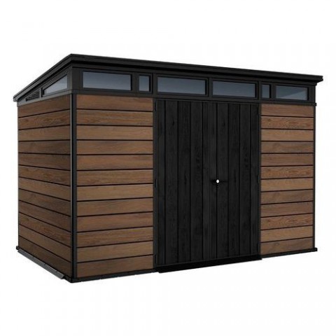 Plastový zahradní domek Horizontal v hnědém provedení je bezúdržbový a je vyroben z jedinečného materiálu Decocoat, který je inspirován moderním vzhledem v imitaci dřeva. Robustní konstrukce s dvojitými stěnami a kovovými výztuhami. Pevná střecha, široké dvojité dveře o rozměru 140 x 182 cm a podlaha pro náročné použití s nosností 150 kg na m2. Domek je velmi stabilní díky zpevněné ocelové konstrukci. Vhodný pro uschovávání nářadí a zahradních doplňků, ale také na sekačku nebo grill. Zatížení střechy až 150 kg/m2 a odolnost vůči větru do 145 km/hod (platí v případě ukotvení). Mezi další výhody se řadí okna, světlíky, vysoká podlaha a zajišťovací systém.Zahradní domek Horizontal 11 x 7, hnědý