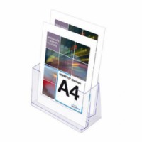 Plastové stojánky na letáky, brožury, propagační materiály apod. Dvě kapsy ve stupních za sebou orientované na výšku. Možnost upevnění na zeď. Stojánek je standardně dodáván bez potisku.Zásobníky na letáky JD1, 2 kapsy na výšku