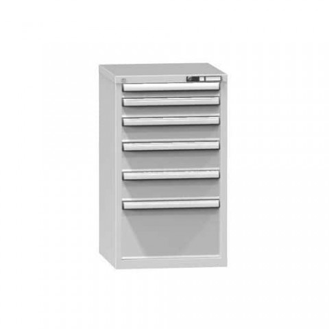 Zásuvková skříň je opatřená mechanismem centrálního zamykání a blokace zásuvek. Zásuvky jsou základním skladovacím prvkem, a proto splňují vysoké požadavky na pevnost a stabilitu. Korpusy zásuvkových skříní tvoří svařenec jednotlivých konstrukčních dílů z kvalitních ocelových plechů. Vnitřní konstrukce korpusů je opatřena perforací po 25 mm. Tuto perforaci využíváme k uchycení vodicích lišt zásuvek, jejich výškovému uspořádání a nakonfigurování požadované zásuvkové sestavy. Přestavování vodicích lišt nebo háčků polic probíhá jednoduše a velice rychle bez použití nástrojů.Zásuvkové skříně ZA4, 578 x 600 x 990 mm