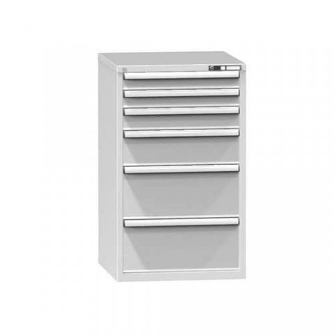 Zásuvková skříň je opatřená mechanismem centrálního zamykání a blokace zásuvek. Zásuvky jsou základním skladovacím prvkem, a proto splňují vysoké požadavky na pevnost a stabilitu. Korpusy zásuvkových skříní tvoří svařenec jednotlivých konstrukčních dílů z kvalitních ocelových plechů. Vnitřní konstrukce korpusů je opatřena perforací po 25 mm. Tuto perforaci využíváme k uchycení vodicích lišt zásuvek, jejich výškovému uspořádání a nakonfigurování požadované zásuvkové sestavy. Přestavování vodicích lišt nebo háčků polic probíhá jednoduše a velice rychle bez použití nástrojů.Zásuvkové skříně ZB5, 731 x 753 x 1215 mm