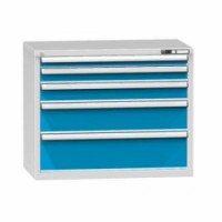 Zásuvková skříň je opatřená mechanismem centrálního zamykání a blokace zásuvek. Zásuvky jsou základním skladovacím prvkem, a proto splňují vysoké požadavky na pevnost a stabilitu. Korpusy zásuvkových skříní tvoří svařenec jednotlivých konstrukčních dílů z kvalitních ocelových plechů. Vnitřní konstrukce korpusů je opatřena perforací po 25 mm. Tuto perforaci využíváme k uchycení vodicích lišt zásuvek, jejich výškovému uspořádání a nakonfigurování požadované zásuvkové sestavy. Přestavování vodicích lišt nebo háčků polic probíhá jednoduše a velice rychle bez použití nástrojů.Zásuvkové skříně ZC5, 1037 x 600 x 840 mm