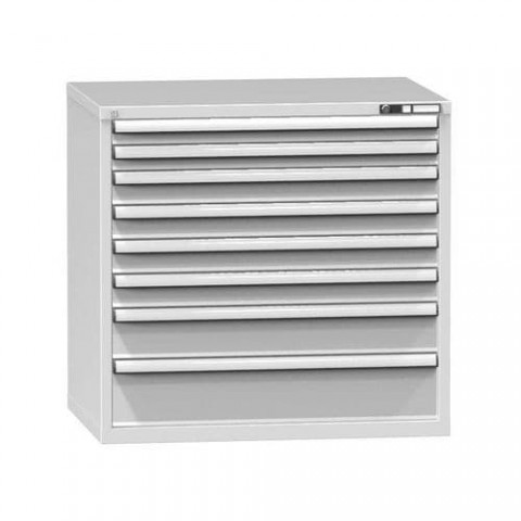 Zásuvková skříň je opatřená mechanismem centrálního zamykání a blokace zásuvek. Zásuvky jsou základním skladovacím prvkem, a proto splňují vysoké požadavky na pevnost a stabilitu. Korpusy zásuvkových skříní tvoří svařenec jednotlivých konstrukčních dílů z kvalitních ocelových plechů. Vnitřní konstrukce korpusů je opatřena perforací po 25 mm. Tuto perforaci využíváme k uchycení vodicích lišt zásuvek, jejich výškovému uspořádání a nakonfigurování požadované zásuvkové sestavy. Přestavování vodicích lišt nebo háčků polic probíhá jednoduše a velice rychle bez použití nástrojů.Zásuvkové skříně ZG5, 1037 x 753 x 990 mm
