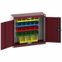 Závěsná kovová skříňka s perforací a sadou plastových boxů pro uložení nářadí. Perforovaný zadní panel skříňky pro zavěšení plastových boxů (typ louvre) a dvířka skříňky s perforovanou vnitřní stranou pro umístění držáků nářadí (typ perfo). Robustní svařovaná ocelová konstrukce s nosností až 1 tuna, povrchová úprava práškovým lakem. Zamykání cylindrickým zámkem se dvěma klíči. Sada 23 boxů obsahuje 20 x plastový box č. 2 (v x š x h) 8,3 x 10,3 x 16,5 cm: 5 x žlutý, 10 x červený, 5 x modrý a plastový box č. 3 (v x š x h) 12,5 x 14,5 x 24 cm: 3 x žlutý. Sada 33 boxů obsahuje 28 x plastový box č. 2 (v x š x h) 8,3 x 10,3 x 16,5 cm: 7 x žlutý, 7 x červený, 14 x modrý a plastový box č. 3 (v x š x h) 12,5 x 14,5 x 24 cm: 5 x žlutý. Sada 43 boxů obsahuje 28 x plastový box č. 2 (v x š x h) 8,3 x 10,3 x 16,5 cm: 7 x žlutý, 7 x červený, 14 x modrý a 15 x plastový box č. 3 (v x š x h) 12,5 x 14,5 x 24 cm: 5 x žlutý, 5 x červený, 5 x modrý.Závěsné skříňky Bott Cubio s boxy a perfopanely na nářadí