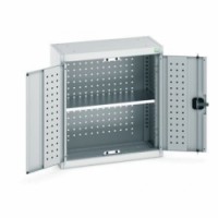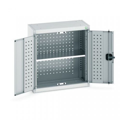 Závěsná kovová skříňka s perforovanou zadní stěnou a 1 policí. Zadní část skřínky a vnitřní část dveří jsou opatřeny perforovanými panely pro uchycení držáků nářadí (typ perfo). Pozinkovaná police výškově nastavitelná v rastru 25 mm. Robustní svařovaná ocelová konstrukce s nosností až do 1 tuny, povrchová úprava práškovým lakem. Zamykání cylindrickým zámkem se dvěma klíči. Plastové boxy a držáky nářadí nejsou součastí dodávky.Závěsné skříňky Bott Cubio s perfopanely, 1 police