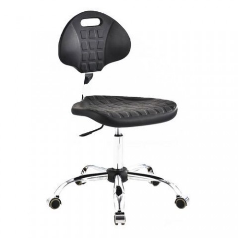 ESD otočná židle s využitím v průmyslu, dílnách nebo laboratořích. Nastavení výšky sedáku pomocí pneumatického pístu. Sedák a opěradlo z polyuretanové pěny a podstavec z chromované oceli. Plastová kolečka vhodná pro tvrdé povrchy. Hmotnost židle je 13 kg.Antistatická ESD pracovní židle Ralph s kolečky