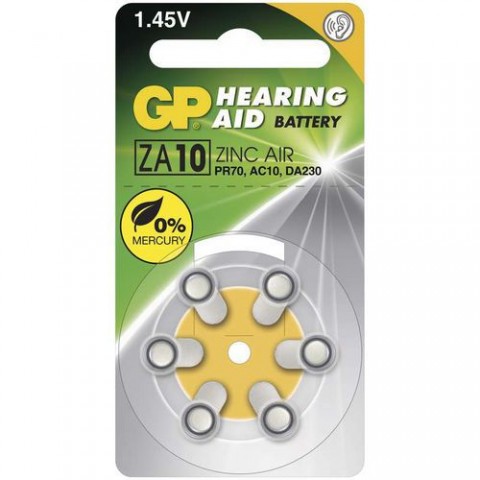 Řada těchto zinkovzdušných baterií nachází hlavní uplatnění v medicínském oboru jako baterie do naslouchadel. Konstrukce a charakteristika baterie poskytuje maximální výkon pro stálé pracovní napětí při různých okolních teplotách, což je prvním krokem pro maximální spolehlivost baterie. Jejich doba skladování je až 3 roky a pracovní teplota -20 °C až +40 °C. jmenovitá kapacita: 90 mAh (při zátěži 1,5 kOhm) cena za množství: cena za 6 ks rozměr: 5,8 × 3,6 mm kategorie/řada: Hearing Aid napětí: 1,45 V chemické složení: zinkovzdušné typové označení: GP ZA10 (7005ZD, PR70) prodejní obal: 6 ks, blistrBaterie do naslouchadel GP ZA10, blistr